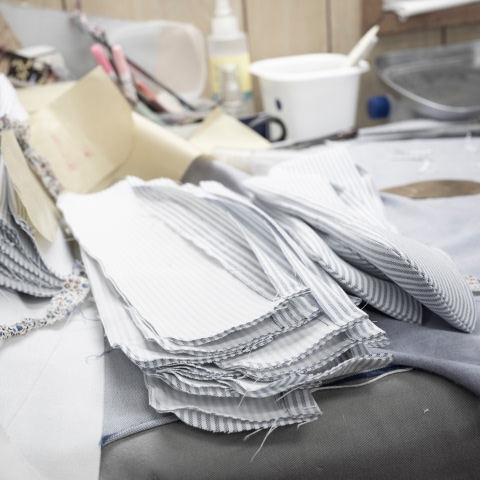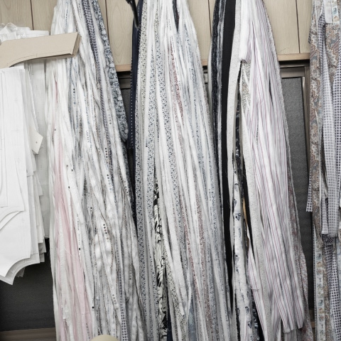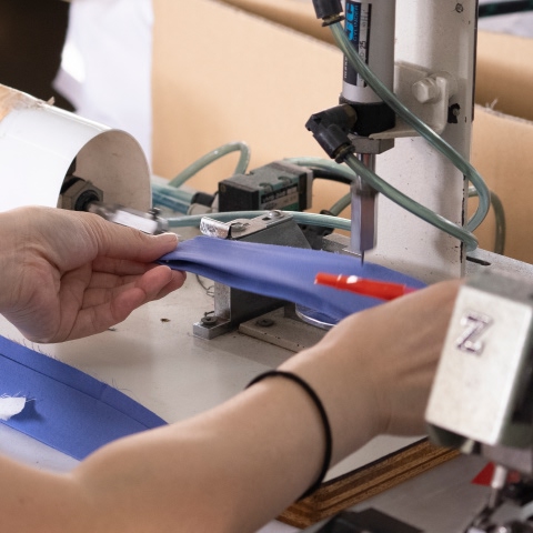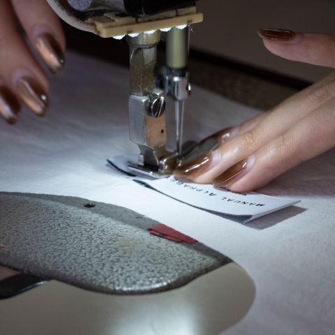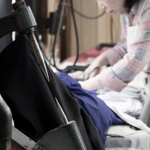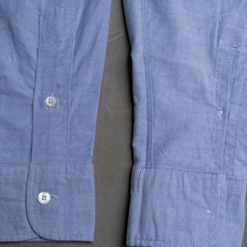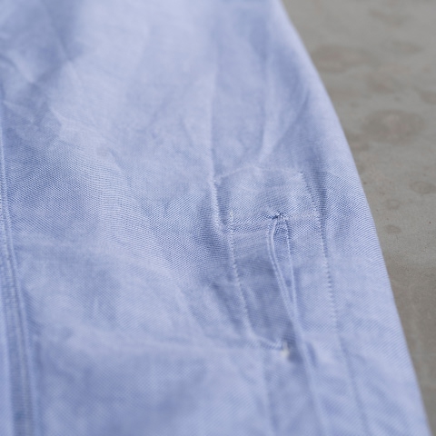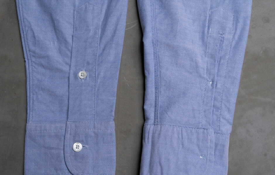 裏返した際に折り返し部分が 表に出ない・見えないように処理することで、肌あたりを良くし、袖まくりをしたときにも美しいシルエットが保たれます。自動機を使わず、職人が一つひとつ 手作業でパーツを作成。手間を惜しまず、パターンの指示に忠実に、正確に作り上げられています。