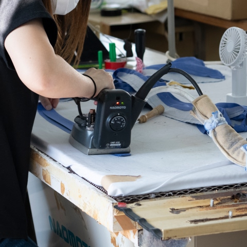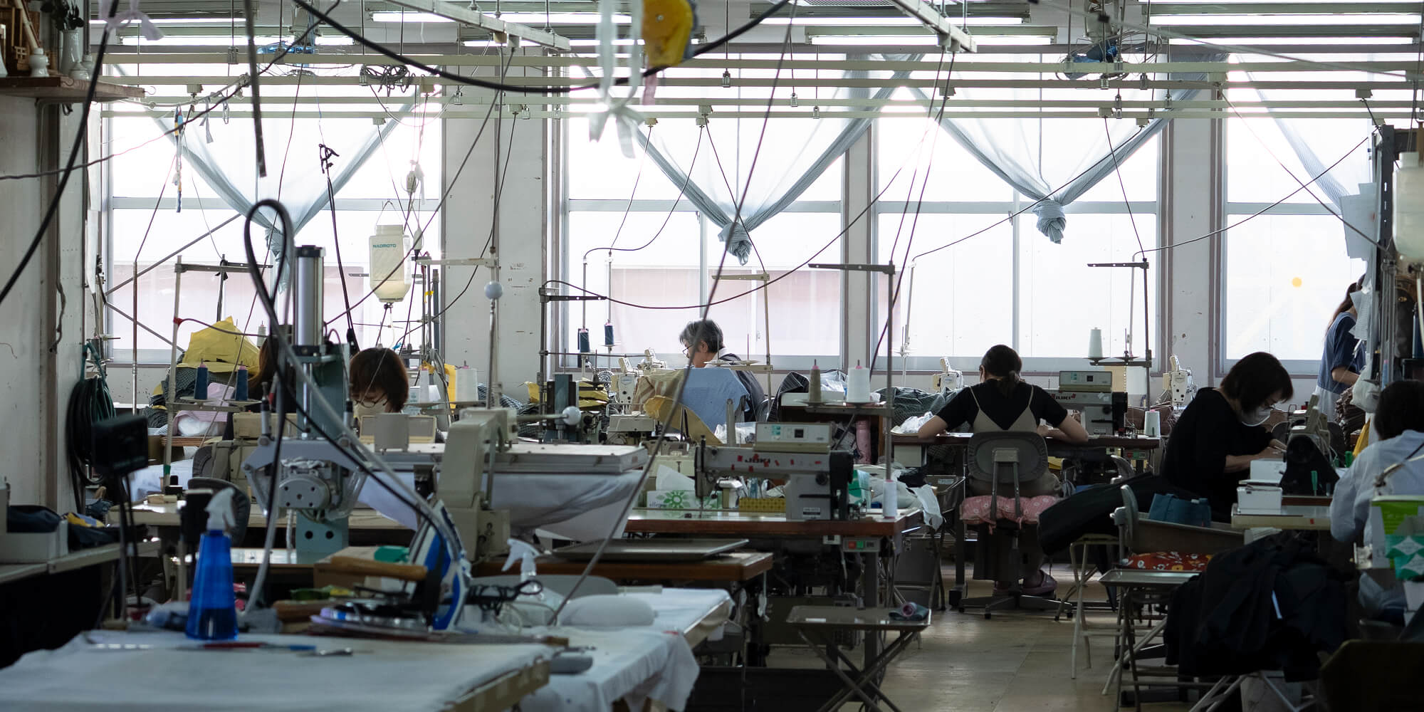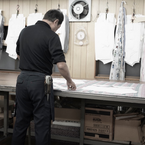 大阪・枚方に位置する工場は、1968年創業の歴史ある工場です。現在、2代目社長が約3名の体制で工場を運営しています。MANUAL ALPHABETにシャツ作りの基本と「段付け」と呼ばれる特殊な縫製技術を伝授した師でもあります。ここでは、スーピマ、プレミアム、オックスフォードといった上質な生地を用いたシャツが一貫して生産されています。社長は「日本製のシャツの良さ=味のある佇まい。工業製品ではない手仕事の風合いと温かみが真骨頂」と語り、社長自らが最終仕上げを一点一点、徹底して行います。かつて、社長の息子さんが「MANUAL ALPHABETの違いは触ればわかる」と語ったエピソードは、まさにブランド名を象徴しています。