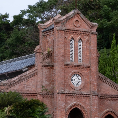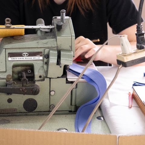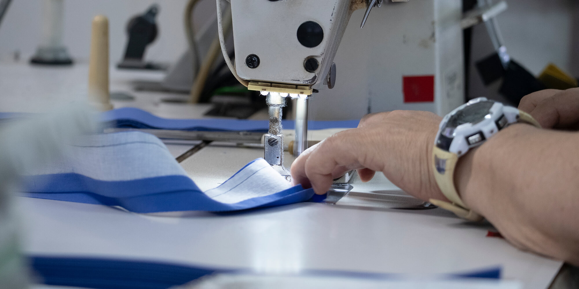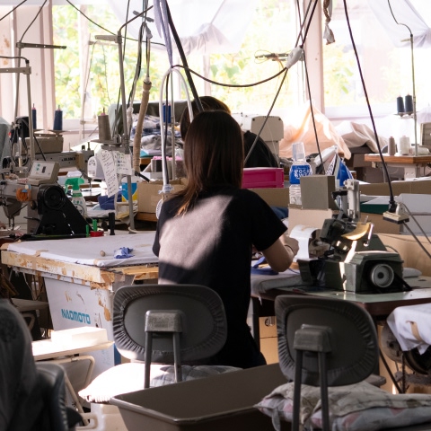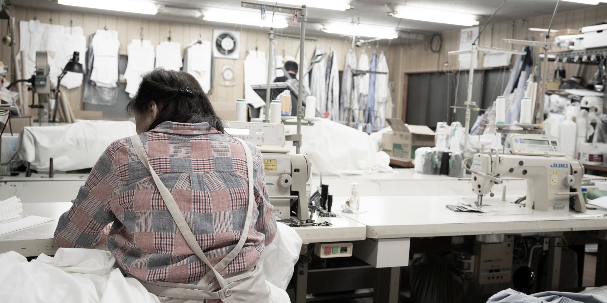 長崎県五島列島。雄大な自然に恵まれた穏やかな環境な方、古いは隠れキリシタンが多数存在したことを示す歴史跡や教会が点在する島。工場は、1985年に地域雇用活性化のために設立されました。かつては年間20万着もの学生服を生産していましたが、現在は約20名の全員日本人スタッフ(20代から50代)がシャツ専業工場として、高密度で繊細な縫製技術を継承しています。素材の特性に合わせてミシンを調整し、仕上がりは線を描くように端正です。台風時には島への物流が止まることもあるという、自然と共生する島の環境は、製品にも温もりある佇まいとなって現れます。